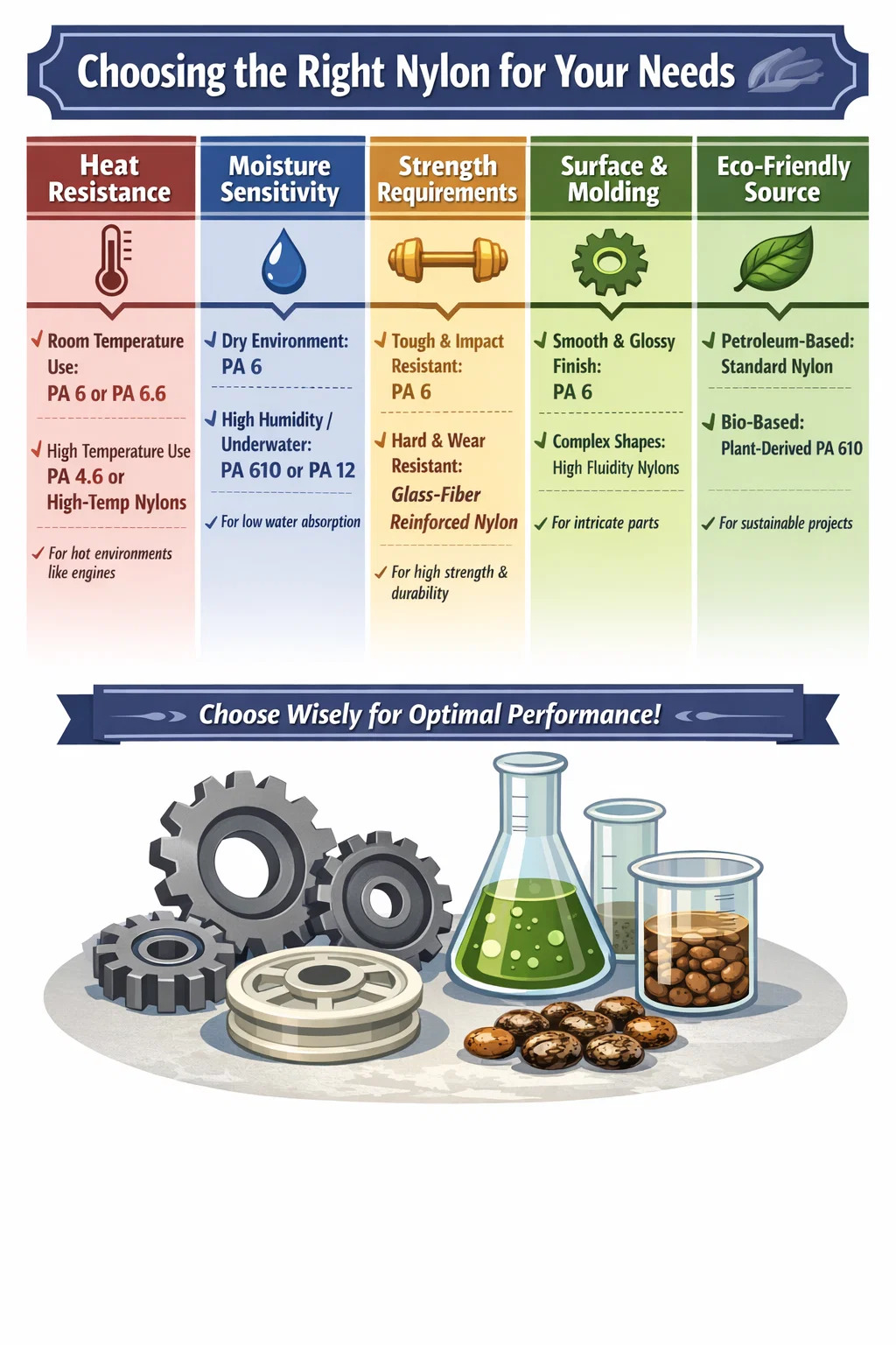 Sursă verde: Există, de asemenea, multe nailon extrase din plante (cum ar fi uleiul de ricin), care sunt cunoscute ca nailon pe bază de bio (cum ar fi unele componente ale PA 610). Dacă proiectul dvs. pune accent pe protecția verde și a mediului, acest tip de sursă de poliamidă va fi mai atractiv.