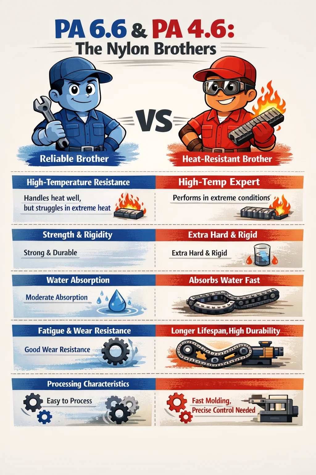 În familia nailonului, PA 6.6 și PA 4.6 sunt ca doi frați, asemănători ca aspect, dar cu personalități și capacități distincte. Ambele aparțin familiei poliamidelor, dar funcționează destul de diferit atunci când se confruntă cu temperaturi ridicate și aplicații cu stres ridicat.
