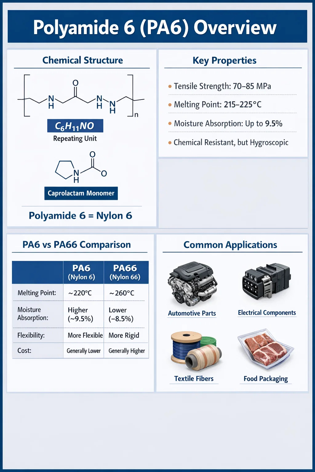 PA6 înseamnă Poliamida 6 , un polimer termoplastic semicristalin produs prin polimerizarea cu deschidere a inelului a caprolactamei. Aparține familiei mai largi de nailon și este unul dintre cele mai utilizate materiale plastice de inginerie din lume. "6" se referă la cei șase atomi de carbon din unitatea monomer repetată derivată din caprolactamă (C₆H₁₁NO). PA6 este, de asemenea, denumit în mod obișnuit Nylon 6 și ambii termeni descriu același material de bază.